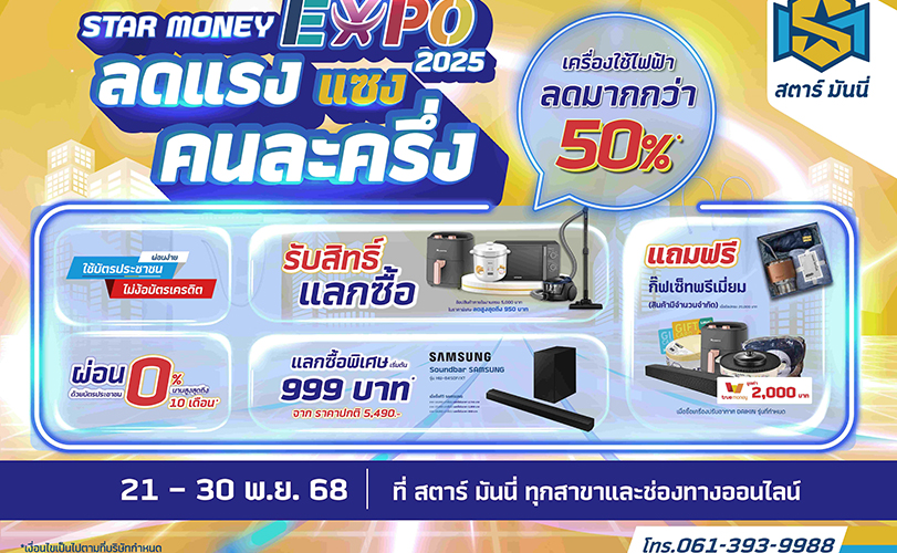 บมจ.สตาร์ มันนี่ (STARM) จัดหนักส่งท้ายปี เปิดงาน “Star Money Expo 2025” ยิ่งใหญ่กว่าที่เคย ขนทัพเครื่องใช้ไฟฟ้ามาลดแบบกระแทกใจยิ่งกว่าโปรฯคนละครึ่ง เพราะลดมากกว่า 50% พร้อมเสิร์ฟของแถมแบบจัดเต็ม และสิทธิพิเศษอีกเพียบ!! เริ่มตั้งแต่ 21 – 30 พ.ย.68 พบกันได้ที่ สตาร์ มันนี่ ทุกสาขา และลูกค้าภาคตะวันออกสามารถทำสัญญาผ่อนผ่านออนไลน์ได้แล้วคร้า!!.. โปรเด็ด โปรจุกแบบนี้ แว่วๆว่า… ผลงาน STARM ปีนี้ มีลุ้นพุ่งต่อแบบไม่มีเบรก