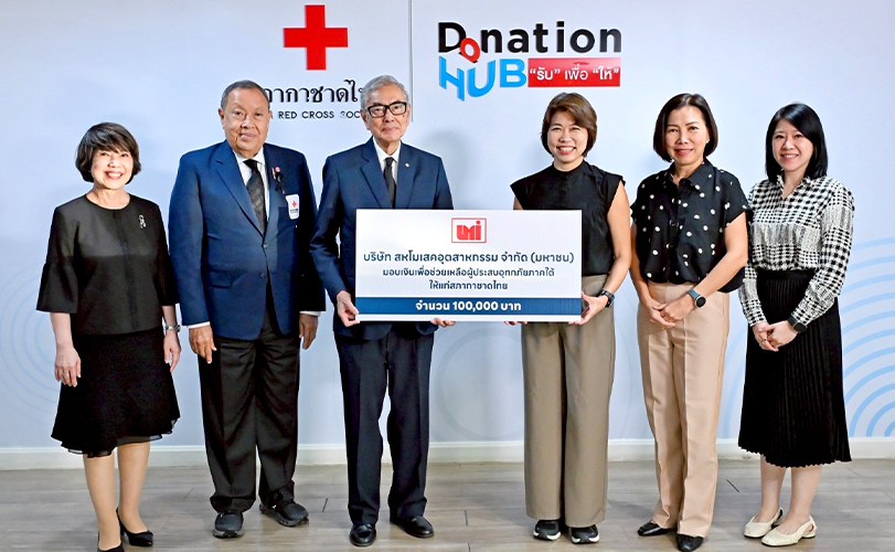 นางสาวรติรัตน์ เหล่าวิวัฒน์วงศ์ ผู้ช่วยกรรมการผู้จัดการ และ นางสาวกิรัชฌา เหล่าวิวัฒน์วงศ์ ผู้อำนวยการสำนักงานการบุคคลกลาง บริษัท สหโมเสคอุตสาหกรรม จำกัด (มหาชน) หรือ UMI มอบเงินเพื่อช่วยเหลือผู้ประสบอุทกภัยภาคใต้ 100,000 บาท ให้แก่สภากาชาดไทย