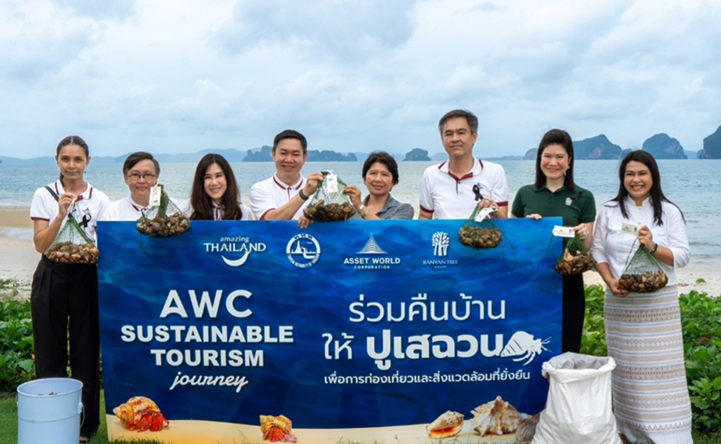 นายรุ่งเรือง วิโรจน์ชีวัน Head of Hotel Operations นายชานน เหลืองอุทัย Head of Cost & Contract and Strategic Procurement บริษัท แอสเสท เวิรด์ คอร์ป จำกัด (มหาชน) (AWC) และทีมผู้บริหาร ร่วมอนุรักษ์ระบบนิเวศทางทะเล กับโครงการ “คืนบ้านให้ปูเสฉวน” มอบเปลือกหอยฝาเดียว น้ำหนักรวมกว่า 40 กิโลกรัม ให้แก่ นางสาวโศรยา หอมชื่น ผู้อำนวยการการท่องเที่ยวแห่งประเทศไทย (ททท.) สำนักงานกระบี่ เพื่อส่งต่อให้ อุทยานแห่งชาติหมู่เกาะลันตา จังหวัดกระบี่