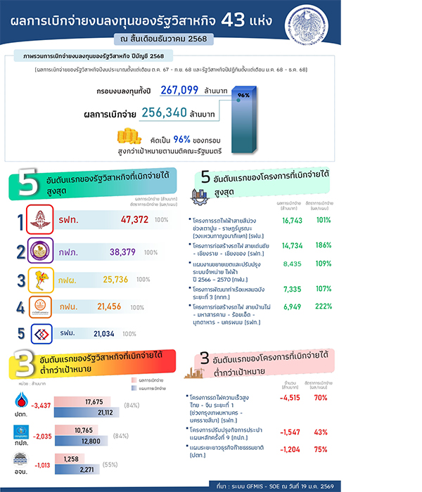 โดยการเบิกจ่ายงบลงทุนของรัฐวิสาหกิจ ประจำปีบัญชี 2568 ที่อยู่ในการติดตามของ สคร. อย่างใกล้ชิด จำนวน 43 แห่ง (รัฐวิสาหกิจปีงบประมาณ 34 แห่ง และรัฐวิสาหกิจปีปฏิทิน 9 แห่ง) มีการเบิกจ่ายงบลงทุนจนถึงสิ้นปีบัญชี 2568 จำนวน 256,340 ล้านบาท หรือคิดเป็นร้อยละ 96 จากกรอบงบลงทุนทั้งสิ้น จำนวน 267,099 ล้านบาท แบ่งเป็นผลการเบิกจ่ายงบลงทุนของรัฐวิสาหกิจปีงบประมาณ (ตั้งแต่เดือนตุลาคม 2567 - เดือนกันยายน 2568) จำนวน 133,787 ล้านบาท หรือร้อยละ 95 ของกรอบงบลงทุน และรัฐวิสาหกิจปีปฏิทิน (เดือนมกราคม 2568 - เดือนธันวาคม 2568) จำนวน 122,553 ล้านบาท หรือร้อยละ 97 ของกรอบงบลงทุน ทั้งนี้ รัฐวิสาหกิจปีงบประมาณที่เบิกจ่ายได้ไม่ต่ำกว่าร้อยละ 95 ของแผนการเบิกจ่ายและมีมูลค่าสูงสุด 3 อันดับ ได้แก่ การรถไฟแห่งประเทศไทย (รฟท.) การรถไฟฟ้าขนส่งมวลชนแห่งประเทศไทย (รฟม.) และการประปานครหลวง (กปน.) และรัฐวิสาหกิจปีปฏิทินที่เบิกจ่ายได้ไม่ต่ำกว่าร้อยละ 95 ของแผนการเบิกจ่ายและมีมูลค่าสูงสุด 3 อันดับ ได้แก่ การไฟฟ้าส่วนภูมิภาค การไฟฟ้าฝ่ายผลิตแห่งประเทศไทย และการไฟฟ้านครหลวง