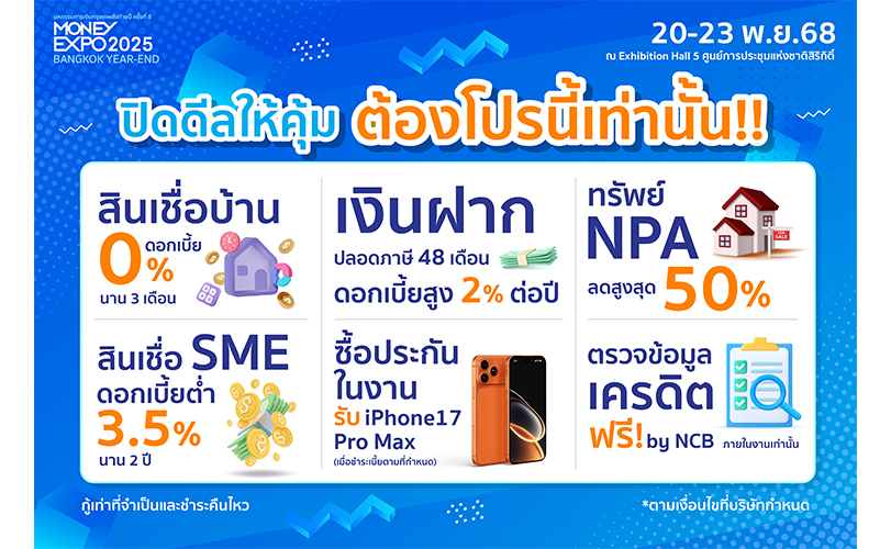 มหกรรมการเงินกรุงเทพส่งท้ายปี ครั้งที่ 8 MONEY EXPO 2025 BANGKOK YEAR-END ขนทัพแบงก์ บล. บลจ. ประกัน หน่วยงานรัฐและเอกชนชั้นนำ อัดโปรโมชั่นสุดพิเศษส่งท้ายปี พร้อมกิจกรรมตลอด 4 วันเต็ม ระหว่างวันที่ 20-23 พฤศจิกายน 2568 เวลา 10.00-20.00 น. ณ ฮอลล์ 5 ชั้น LG ศูนย์การประชุมแห่งชาติสิริกิติ์
