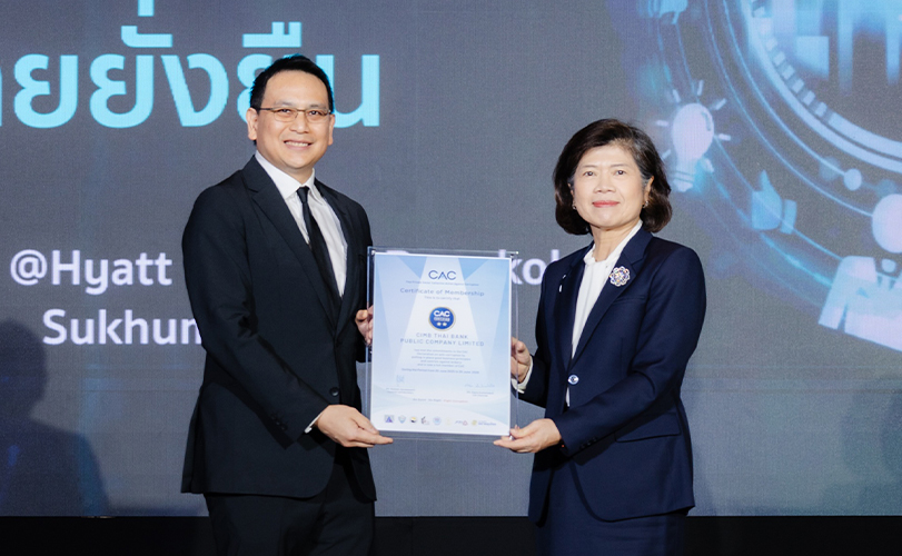 นายวุธว์ ธนิตติราภรณ์ กรรมการผู้จัดการใหญ่ และประธานเจ้าหน้าที่บริหาร ธนาคาร ซีไอเอ็มบี ไทย ได้รับมอบประกาศนียบัตรรับรองการเป็นสมาชิกแนวร่วมต่อต้านคอร์รัปชันของภาคเอกชนไทย ซึ่งธนาคาร ซีไอเอ็มบี ไทย ได้รับรองการเป็นสมาชิกฯ ต่อเนื่อง เป็นครั้งที่ 2 (CAC Recertification) จากแนวร่วมต่อต้านคอร์รัปชันของภาคเอกชนไทย (Thai Private Sector Collective Action Against Corruption (CAC)) ในงาน CAC Certification Ceremony 2/2025 ณ โรงแรมไฮแอท รีเจนซี่ กรุงเทพฯ
