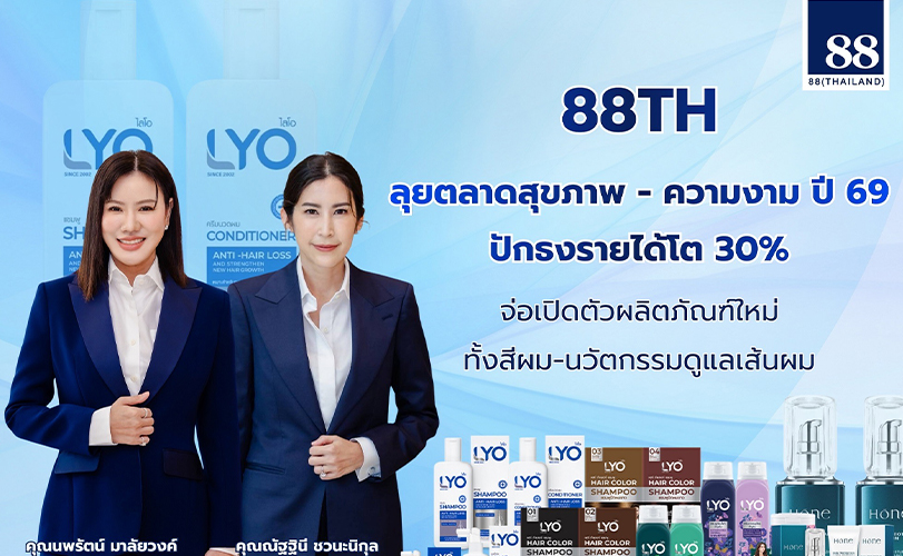 บมจ. 88(ไทยแลนด์) “88TH” ชี้ภาพรวมตลาดสุขภาพและความงามโตต่อเนื่อง ตั้งเป้ารายได้ปี 2569 โต 20-30% ชูผลิตภัณฑ์ของแบรนด์ LYO (ไลโอ) เป็นโปรดักฮีโร่ และเตรียมเปิดตัวผลิตภัณฑ์ใหม่ ทั้งสีผมแฟชั่น และนวัตกรรมดูแลเส้นผมรายแรกของไทย เพื่อขยายฐานลูกค้าและสร้างความแตกต่างในตลาด ประกาศปักธงรุกตลาดต่างประเทศ จีน ฮ่องกง