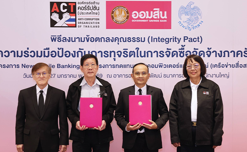 นายมานะ ทรวงทองหลาง รองผู้อำนวยการธนาคารออมสิน กลุ่มเทคโนโลยีสารสนเทศและธุรกิจดิจิทัล ลงนามบันทึกข้อตกลงคุณธรรม (Integrity Pact) กับ คณะผู้สังเกตการณ์ตามข้อตกลงคุณธรรม ประกอบด้วย กรมบัญชีกลาง และองค์กรต่อต้านคอร์รัปชัน (ประเทศไทย) จำนวน 2 โครงการ ได้แก่ โครงการ New Mobile Banking และ โครงการทดแทนระบบคอมพิวเตอร์และอุปกรณ์ : แผนงานสนับสนุนสาขา/พัฒนาโครงสร้างพื้นฐาน (Infrastructure) ซึ่งเป็นความร่วมมือป้องกันการทุจริตในการจัดซื้อจัดจ้างภาครัฐ ตามยุทธศาสตร์ในการป้องกันและปราบปรามการทุจริตคอร์รัปชันอย่างยั่งยืนของรัฐบาล ที่มีนโยบายส่งเสริมการบริหารงานที่มีธรรมาภิบาล และการป้องกันปราบปรามการทุจริตและประพฤติมิชอบในภาครัฐที่สร้างความไม่เป็นธรรมและเหลื่อมล้ำในสังคม สำหรับโครงการที่มีวงเงินจัดซื้อจัดจ้างตั้งแต่ 1,000 ล้านบาทขึ้นไป โดยสอดคล้องกับการดำเนินการด้วยหลักธรรมาภิบาลของธนาคาร ที่ให้ความสำคัญในการบริหารจัดการงบประมาณ และทรัพยากรของธนาคาร ด้วยความรอบคอบ โปร่งใส และเกิดประโยชน์สูงสุด มีกระบวนการทำงานที่มีความสุจริต เที่ยงธรรม ตรวจสอบได้ในทุกขั้นตอน และเปิดโอกาสให้ภาคเอกชนเข้าแข่งขันอย่างเท่าเทียม โดยมี นางสาวศิริพร เลิศสัตยสุกใส นายณัทธร โพธิแพทย์ รองผู้อำนวยการธนาคารออมสิน พร้อมด้วย นางสาวสิรินันท์ จิรดิลก กรรมการผู้จัดการ บริษัท จีเอสบี ไอที แมเนจเม้นท์ จำกัด ในฐานะกรรมการโครงการ และนายกิตติเดช ฉันทังกูล ผู้อำนวยการองค์กรต่อต้านคอร์รัปชัน (ประเทศไทย) ร่วมเป็นสักขีพยาน ณ อาคารออมสินพิพัฒน์ ธนาคารออมสิน สำนักงานใหญ่