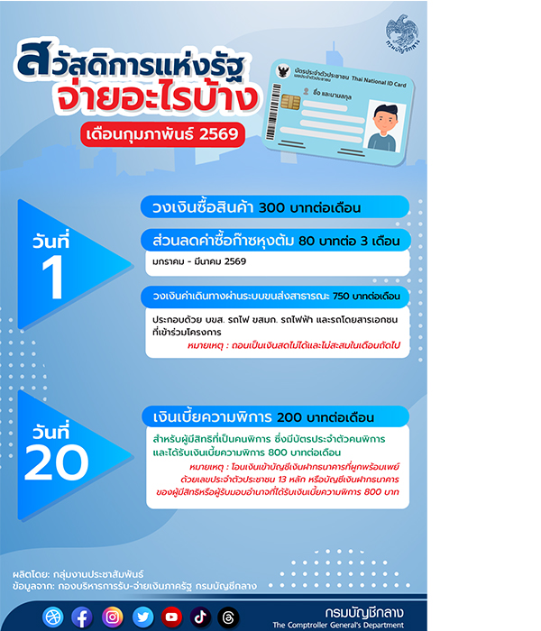 กรมบัญชีกลางอัปเดตสวัสดิการแห่งรัฐ เดือนกุมภาพันธ์ 2569 จ่ายอะไรบ้าง