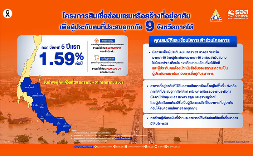 ธอส. ร่วมกับ สปส. จัดทำสินเชื่อซ่อมแซมหรือสร้างที่อยู่อาศัยเพื่อผู้ประกันตนที่ประสบอุทกภัย ฟื้นฟู 9 จังหวัดภาคใต้ อัตราดอกเบี้ย 5 ปีแรกเพียง 1.59% ต่อปี
