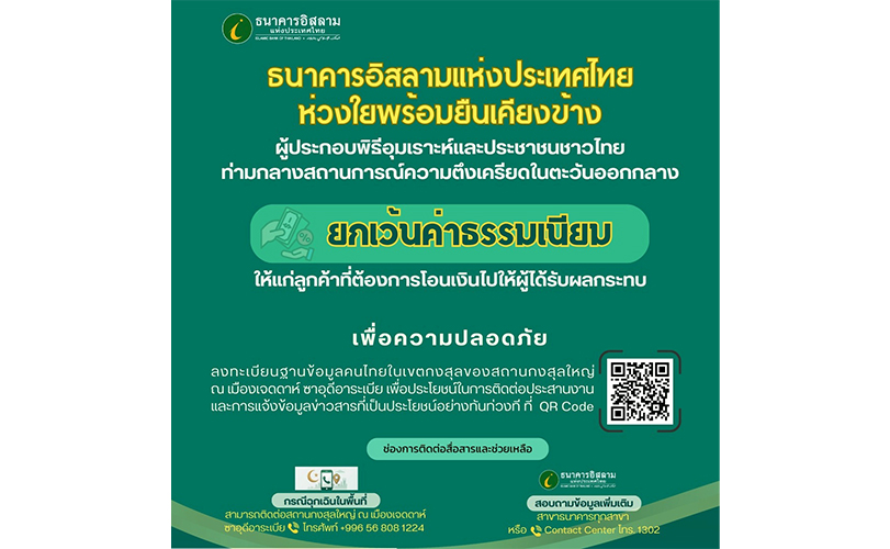 ธนาคารอิสลามแห่งประเทศไทยวิงวอนขอดุอาอ์ให้พี่น้องประชาชนชาวไทยทุกท่านที่พำนักอยู่ในพื้นที่ดังกล่าวมีความปลอดภัยจากเหตุการณ์ความตึงเครียดที่เกิดขึ้น และสามารถเดินทางกลับสู่ประเทศไทยโดยสวัสดิภาพ ทั้งนี้ ธนาคารจะยังคงติดตามสถานการณ์อย่างใกล้ชิดและพร้อมให้การสนับสนุนอย่างเต็มกำลังในทุกมิติที่สามารถดำเนินการได้