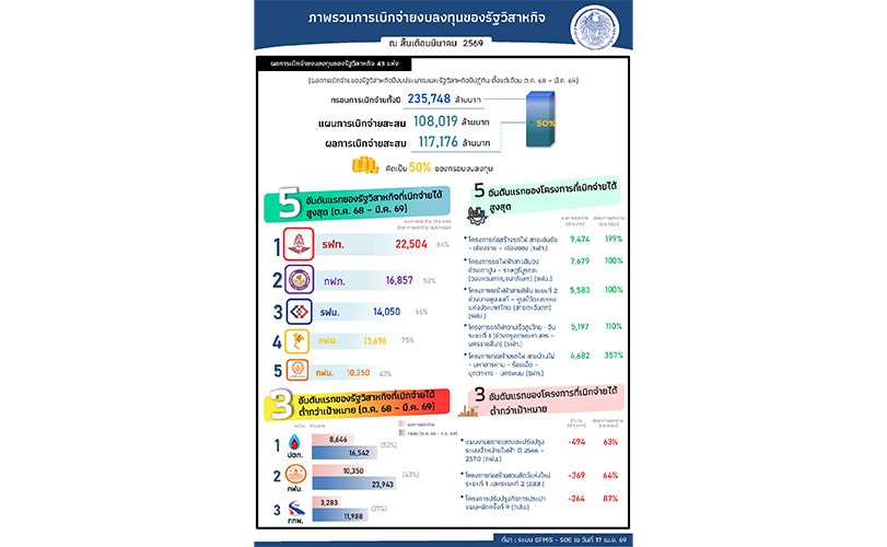 รัฐวิสาหกิจเบิกจ่ายงบลงทุนครึ่งปีงบประมาณ 2569 กว่า 1.17 แสนล้านบาท”