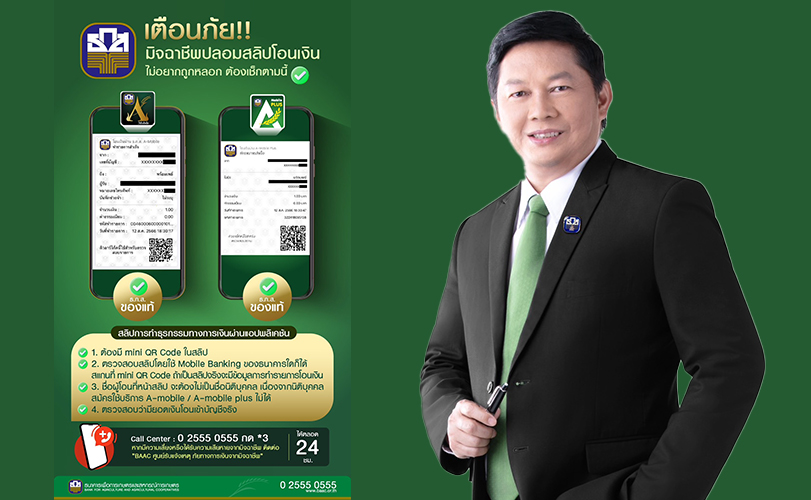 นายไพศาล หงษ์ทอง ผู้ช่วยผู้จัดการและโฆษกธนาคารเพื่อการเกษตรและสหกรณ์การเกษตร (ธ.ก.ส.) เปิดเผยว่า ด้วยขณะนี้ มีกลุ่มผู้ไม่หวังดีปลอมแปลงหลักฐานการโอนเงิน (e-Slip) โดยใช้รูปแบบสลิป (Template) ของธนาคารในการหลอกลวงผู้อื่นในการชำระค่าสินค้า-บริการ ทำให้เกิดความเสียหายกับผู้ประสบเหตุการณ์ ธ.ก.ส. จึงขอให้เกษตรกรลูกค้าและประชาชนทั่วไปโปรดระมัดระวังและอย่าหลงเชื่อบริษัทหรือบุคคลที่มีพฤติการณ์ดังกล่าว ทั้งนี้ ธ.ก.ส. ขอแนะนำวิธีการตรวจสอบหลักฐานโอนเงินที่สามารถทำด้วยตนเองได้ง่าย ๆ ดังนี้ 1) สลิปการโอนเงินที่ออกจากแอปพลิเคชัน A-Mobile Plus หรือ ธ.ก.ส. A-Mobile ต้องมี mini QR Code ที่สามารถตรวจสอบโดยใช้แอปพลิเคชัน Mobile Banking ของธนาคารใดก็ได้ สแกนที่ mini QR Code ซึ่งถ้าเป็นสลิปที่มีการโอนเงินเกิดขึ้นจริงจะมีข้อมูลการทำรายการโอนเงิน 2) ชื่อผู้โอนเงินบนหน้าสลิปจะต้องไม่เป็นชื่อนิติบุคคล เนื่องจากนิติบุคคลไม่สามารถสมัครใช้บริการแอปพลิเคชัน A-Mobile Plus หรือ ธ.ก.ส. A-Mobile ได้ 3) ผู้รับโอนเงินต้องตรวจสอบรายการผ่านแอปพลิเคชัน A-Mobile Plus หรือ ธ.ก.ส. A-Mobile ด้วยว่ามียอดเงินโอนเข้าบัญชีจริงหรือไม่ โดยสมัครบริการ BAAC Connect เพื่อรับข้อมูลการเดินบัญชีแบบเรียลไทม์ผ่านทาง Line Official Account @baacfamily