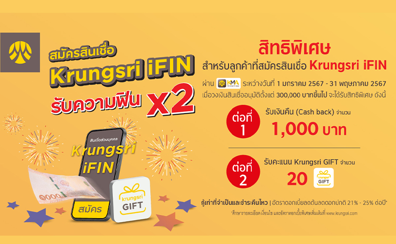 กรุงศรี (ธนาคารกรุงศรีอยุธยา จำกัด (มหาชน)) มอบความฟินคูณสอง เมื่อสมัครสินเชื่อ Krungsri iFIN ผ่าน KMA krungsri app ระหว่างวันที่ 1 มกราคม 2567 – 31 พฤษภาคม 2567 โดยได้รับอนุมัติวงเงินตั้งแต่ 300,000 บาทขึ้นไป และรับเงินกู้โดยวิธีโอนเงินเข้าบัญชีเงินฝากธนาคารกรุงศรีอยุธยา ภายในวันที่ 30 มิถุนายน 2567 และมีการชำระค่างวดสินเชื่อสถานะปกติ รับสิทธิ์ 2 ต่อ