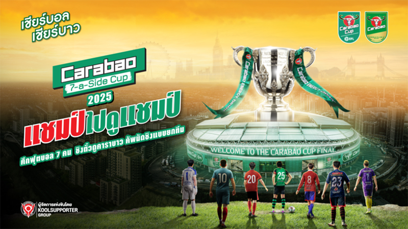 เครื่องดื่ม “คาราบาว” เปิดศึก Carabao 7-a-Side Cup 2025 ชิงเงินรางวัลรวมกว่า 3 ล้านบาท พร้อมพาทีมแชมป์ไปดูนัดชิงชนะเลิศ Carabao Cup 2025/26 ที่สนามเวมบลีย์ อังกฤษ เ พิเศษปีนี้ ร่วมกับ EFL และสมาคมกีฬาฟุตบอล 7 คน เปิดตัว 17 สนามแข่งขัน การันตีมาตรฐานจาก EFL เตรียมเปิดรับสมัคร 256 ทีมจากทั่วประเทศ พร้อมชิงชัยในนัดชิงชนะเลิศ ที่จังหวัดภูเก็ต 14 ธ.ค.นี้