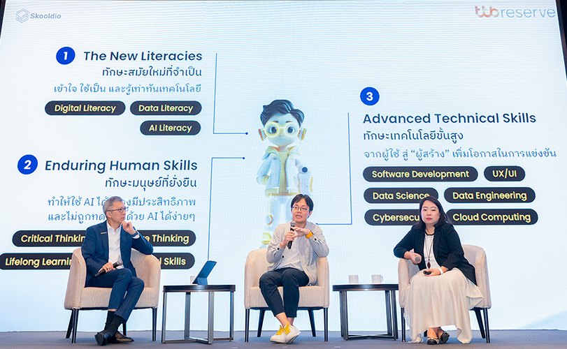 ดร.วิโรจน์ จิรพัฒนกุล กรรมการผู้จัดการและผู้ก่อตั้ง Skooldio ได้แบ่งปันประสบการณ์ว่า ทักษะแห่งอนาคตที่คนรุ่นใหม่ควรเตรียมไว้ สามารถสรุปได้เป็น 3 ประเด็นหลักๆ คือ 1) The New Literacies หรือทักษะสมัยใหม่ที่จำเป็น คือ การเข้าใจและรู้เท่าทันเทคโนโลยี เช่น Digital Literacy, Data Literacy และ AI Literacy ซึ่งเป็นพื้นฐานที่ต้องมี ซึ่งหากเข้าใจและเปิดรับสิ่งเหล่านี้จะเป็นเครื่องมือที่ช่วยยกระดับความรู้ความสามารถได้ 2) Enduring Human Skills หรือทักษะมนุษย์ที่ยั่งยืน คือทักษะที่ไม่มีอะไรทดแทนได้และช่วยให้เราใช้ AI ได้อย่างมีประสิทธิภาพและไม่ถูกแทนที่ด้วย AI ไปได้ง่ายๆ เช่น Critical Thinking และ Creative Thinking ที่เป็นทักษะอันดับต้นๆ ซึ่งจะช่วยขยายศักยภาพในการใช้ AI ให้กว้างไกลขึ้น รวมถึงการมี Interpersonal Skill และการเรียนรู้แบบ Lifelong Learning ซึ่งช่วยส่งเสริมให้คนรุ่นใหม่เรียนรู้ได้ตลอดเวลา และ 3) Advanced Technical Skills หรือทักษะเทคโนโลยีขั้นสูง เช่น Software Development, UX/UI, Cloud Computing เพราะโลกในอนาคตจะเป็นโลกของผู้สร้าง ทักษะในกลุ่มนี้จะช่วยพัฒนาจากผู้ใช้เทคโนโลยีสู่การเป็นผู้สร้างเทคโนโลยี เพิ่มโอกาสในการแข่งขันได้ดียิ่งขึ้นได้ ซึ่งการศึกษาในระบบของต่างประเทศนั้นช่วยส่งเสริมทักษะเหล่านี้ให้บุตรหลานได้