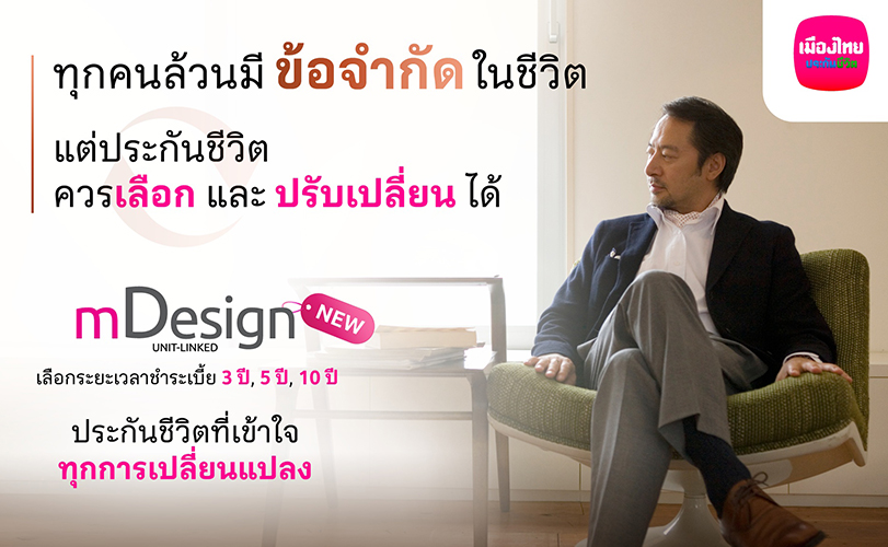 เมืองไทยประกันชีวิต เพิ่มตัวช่วยสร้างพอร์ตชีวิตของคุณให้เติบโตอย่างมั่นคง ด้วยประกันชีวิตควบการลงทุน mDesign จ่ายเบี้ยสั้น 3-5-10 ปี รับความคุ้มครองยาวถึงอายุ 99 ปี การันตีคุ้มครองชีวิตระหว่างช่วงเวลา ชำระเบี้ย