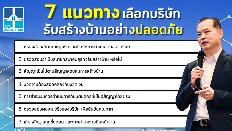 ทั้งนี้ เพื่อให้ผู้บริโภคพิจารณาเลือกบริษัทรับสร้างบ้านอย่างปลอดภัย ทางสมาคมธุรกิจรับสร้างบ้านขอนำเสนอแนวทาง 7 ข้อ สำหรับการตรวจสอบที่รอบด้าน ก่อนตัดสินใจว่าจ้าง