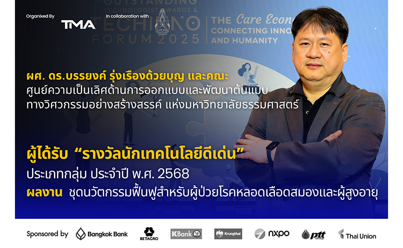 จากแนวคิดเรื่อง Care Economy ทางมูลนิธิส่งเสริมวิทยาศาสตร์และเทคโนโลยีในพระบรมราชูปถัมภ์ ร่วมกับสมาคมการจัดการธุรกิจแห่งประเทศไทย (TMA) ได้ประกาศผลงานด้านนวัตกรรมที่โดดเด่นของคนไทย โดย น.สพ. รุจเวทย์ ทหารแกล้ว ประธานกรรมการคัดเลือก รางวัลนักเทคโนโลยีดีเด่น และนักเทคโนโลยีรุ่นใหม่ ประจำปี 2568 กล่าวว่า “ในปีนี้มี 3 ผลงานที่ผ่านการคัดเลือกและคว้ารางวัล “นักเทคโนโลยีดีเด่น” และ “นักเทคโนโลยีรุ่นใหม่” ประจำปี 2568 ภายใต้แนวคิด “Care Economy” หรือ “เศรษฐกิจใส่ใจ” ซึ่งเป็นแนวคิดเศรษฐกิจรูปแบบใหม่ที่ให้ความสำคัญกับการดูแลสุขภาพกายและใจของผู้คน ควบคู่ไปกับการพัฒนานวัตกรรมและเทคโนโลยีเพื่อยกระดับคุณภาพชีวิตอย่างทั่วถึง โดยรางวัล “นักเทคโนโลยีดีเด่น ประจำปี 2568” ได้รับพระราชทานรางวัลจากสมเด็จพระกนิษฐาธิราชเจ้า กรมสมเด็จพระเทพรัตนราชสุดาฯ สยามบรมราชกุมารี พร้อมเงินรางวัล 1,000,000 บาท และโล่รางวัลพระราชทานประติมากรรม “เรือใบซูปเปอร์มด” จำนวน 2 รางวัล ได้แก่
