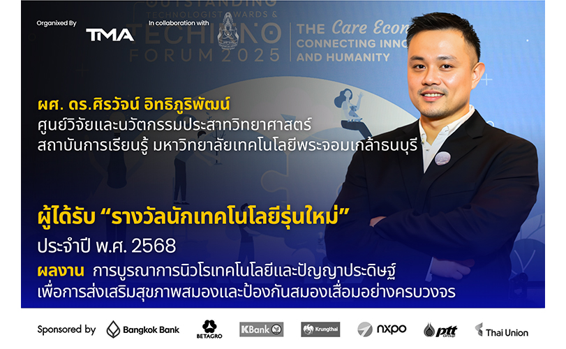 ผศ. ดร.ศิรวัจน์ อิทธิภูริพัฒน์ ศูนย์วิจัยและนวัตกรรมประสาทวิทยาศาสตร์ สถาบันการเรียนรู้ มหาวิทยาลัยเทคโนโลยีพระจอมเกล้าธนบุรี จากผลงาน “การบูรณาการนิวโรเทคโนโลยีและปัญญาประดิษฐ์เพื่อการส่งเสริมสุขภาพสมองและป้องกันสมองเสื่อมอย่างครบวงจร” ผู้คว้ารางวัลนักเทคโนโลยีรุ่นใหม่ กล่าวถึงผลงานที่ได้รับรางวัลในครั้งนี้ว่า “ผมศึกษาเรื่องนิวโรเทคโนโลยี และปัญญาประดิษฐ์เพื่อการส่งเสริมสุขภาพสมองและป้องกันสมองเสื่อม โดยได้เชื่อมโยงแพลตฟอร์มการทำงานร่วมกัน และสุดท้ายคือยกระดับให้เข้าไปถึงบุคคลให้ได้ โดยร่วมกับ บริษัท Startup เพื่อพัฒนาและนำนิวโรเทคโนโลยี มาผสานกับ AI เพื่อประสานองค์ความรู้ โดยแรงผลักดันที่นำไปสู่การประยุกต์ใช้มองภาพตัวขับเคลื่อนอะไร ที่ไปถึงผู้ใช้งาน คำตอบคือ โรคทางสมอง รักษาไม่ได้ แต่สามารถหาแนวทางการป้องกันได้ หากรู้จักผู้ป่วย การป้องกันเป็นสิ่งที่ดีที่สุด ซึ่งเราจำเป็นต้องรู้ข้อมูลสุขภาพของผู้ป่วยให้มากที่สุดจะมีประโยชน์สูงสุด