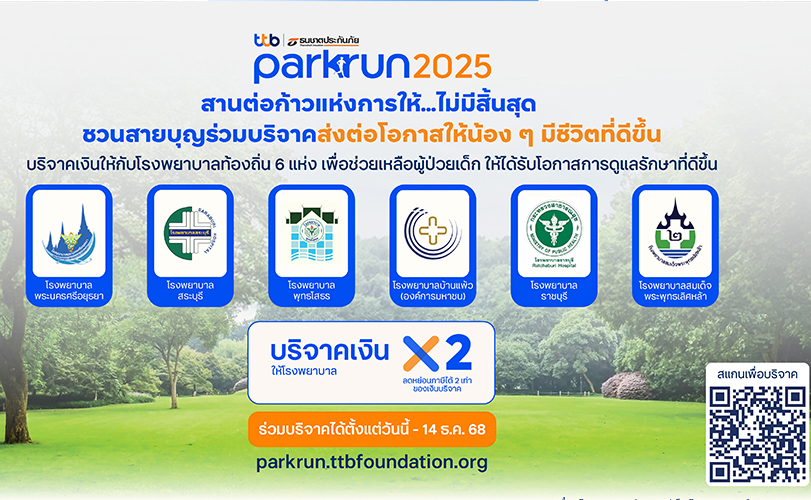 งานเดิน-วิ่งมินิมาราธอนการกุศล “ทีทีบี | ธนชาตประกันภัย พาร์ครัน 2025” จัดขึ้นโดย ทีทีบี ร่วมกับพันธมิตรหลัก ธนชาตประกันภัย ภายใต้แนวคิด “Run for Change เส้นชัยแห่งการให้…ไม่มีสิ้นสุด” เพื่อเปลี่ยนให้ทุกก้าววิ่งไม่ได้จบที่เส้นชัย แต่เป็นการส่งต่อโอกาสให้น้อง ๆ มีชีวิตที่ดีขึ้น ซึ่งหากซื้อบัตรไม่ทัน หรือไม่สะดวกวิ่ง สามารถร่วมเป็นส่วนหนึ่งในการส่งต่อการให้ที่ไม่มีสิ้นสุด ผ่านการร่วมบริจาคได้ตั้งแต่วันนี้ – 14 ธันวาคม 2568 ที่ parkrun.ttbfoundation.org โดยเงินบริจาคสามารถนำไปลดหย่อนภาษีได้ 2 เท่า