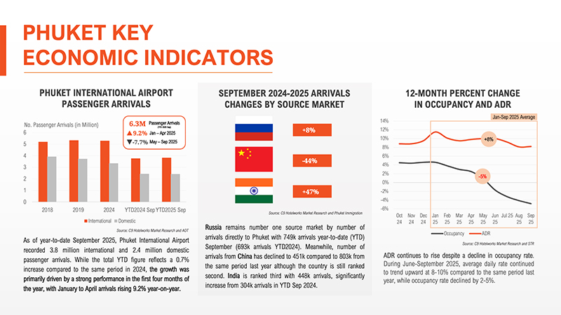 บิล บาร์เน็ตต์ กรรมการผู้จัดการของ C9 Hotelworks กล่าวว่า “ภูเก็ตกำลังกลายเป็น ‘safe haven’ ของทุนต่างชาติในเอเชีย ไม่เพียงเติบโตจากปริมาณนักท่องเที่ยว แต่จากคุณภาพของดีมานด์ที่เปลี่ยนไป โดยอินเดียพุ่ง 47% และรัสเซียยังครองอันดับหนึ่ง นอกจากนี้ ADR ยังเพิ่มขึ้น 8–10% แม้อัตราเข้าพักจะลดลงเล็กน้อย ตัวเลขเหล่านี้สะท้อนชัดว่า ภูเก็ตกำลังก้าวเข้าสู่เศรษฐกิจรีสอร์ตยุคใหม่ที่แข็งแรงและยั่งยืนกว่าเดิม”