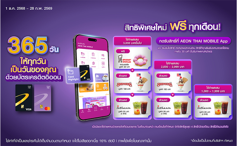 บริษัท อิออน ธนสินทรัพย์ (ไทยแลนด์) จำกัด (มหาชน) สานต่อความสำเร็จ กับแคมเปญ “365 วัน ให้ทุกวันเป็นวันของคุณ” ซึ่งจัดขึ้นเป็นครั้งที่ 3 ภายในปีเดียวกัน เพื่อตอกย้ำความมุ่งมั่นในการดูแลและเติมเต็มไลฟ์สไตล์ลูกค้าอย่างสม่ำเสมอ เพื่อมอบข้อเสนอสุดพิเศษสำหรับผู้ถือบัตรเครดิตอิออน ได้เติมความสุขกับอาหารและเครื่องดื่มเมนูโปรดจากแบรนด์ดังได้คุ้มยิ่งขึ้น เพียงใช้จ่ายผ่านบัตรเครดิตอิออนที่ร่วมรายการ ครบตามเงื่อนไขในเดือนก่อนหน้า รับฟรีพอนเดอริง จาก Mister Donut, E-voucher Swensen’s มูลค่า 100 บาท ส่วนลด 20 บาท ที่ร้าน Inthanin Coffee โปรโมชันพร้อมเสิร์ฟระหว่างวันที่ 1 ธันวาคม 2568 – 28 กุมภาพันธ์ 2569