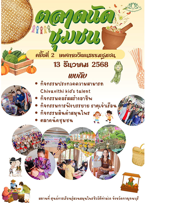 ศูนย์การเรียนรู้สวนสมุนไพรชีววิถีท่าม่วง จังหวัดกาญจนบุรี ร่วมกับสโมสรโรตารีท่าม่วง เตรียมจัดงาน “ตลาดนัดชุมชน – เทศกาลวัฒนธรรมชุมชน ครั้งที่ 2” ในวันที่ 13 ธันวาคม 2568 ณ สวนสมุนไพรชีววิถีท่าม่วง เพื่อส่งเสริมวัฒนธรรมท้องถิ่น สนับสนุนภูมิปัญญาสมุนไพรไทย และสร้างพื้นที่อาชีพให้กับประชาชนในชุมชน