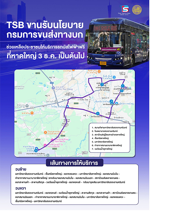 นางสาวกุลพรภัสร์ วงศ์มาจารภิญญา ประธานเจ้าหน้าที่บริหาร บริษัท ไทย สมายล์ บัส จำกัด หรือ TSB เปิดเผยว่า บริษัทฯ ได้ร่วมกับกรมการส่งขนทางบก กระทรวงคมนาคม จัดให้บริการรถโดยสารพลังงานไฟฟ้า จำนวน 4 คัน รับ-ส่งรอบตัวเมืองหาดใหญ่ อำนวยความสะดวกให้ประชาชนเดินทางได้สะดวกสบายมากขึ้น หลังจากรถจักรยานยนต์และรถยนต์ของประชาชนในพื้นที่ได้รับความเสียหายจากน้ำท่วมจนไม่สามารถใช้งานได้