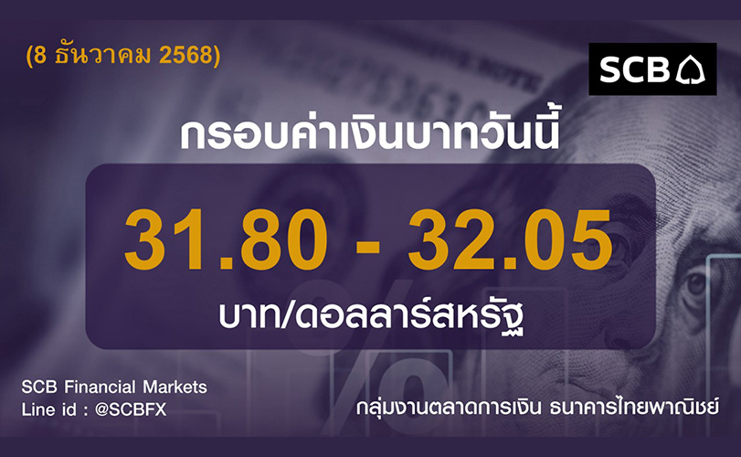 กลุ่มงานตลาดการเงิน ธนาคารไทยพาณิชย์ ประเมินค่าเงินบาท 8 ธันวาคม 2568 เคลื่อนไหวในกรอบ 31.80 - 32.05 บาท/ดอลลาร์