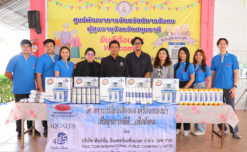 ทีมการตลาดและประชาสัมพันธ์ บริษัท ฟังก์ชั่น อินเตอร์เนชั่นแนล จำกัด (มหาชน) หรือ FTI พร้อมด้วยทีมงาน ลงพื้นที่เปลี่ยนชุดเครื่องกรองน้ำดื่ม เพื่อยกระดับมาตรฐานน้ำดื่มให้สะอาด ปลอดภัย และเพียงพอต่อการใช้งานของผู้พักอาศัยในศูนย์ฯ ณ ศูนย์พัฒนาการจัดสวัสดิการสังคมผู้สูงอายุจังหวัดปทุมธานี