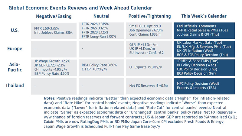 ฝั่งสหรัฐฯ – ไฮไลท์สำคัญจะอยู่ที่รายงานข้อมูลตลาดแรงงานสหรัฐฯ อย่าง ยอดการจ้างงานนอกภาคเกษตรกรรม (Nonfarm Payrolls) ซึ่งจะเน้นที่ข้อมูลเดือนพฤศจิกายน เป็นหลัก และมีข้อมูลเดือนตุลาคมบ้าง จากผลกระทบของภาวะ US Government Shutdown ที่ผ่านมา นอกจากนี้ ผู้เล่นในตลาดจะรอลุ้น รายงานอัตราเงินเฟ้อ CPI รวมถึงรายงานข้อมูลเศรษฐกิจสำคัญอื่นๆ อย่าง ยอดค้าปลีก (Retail Sales) รวมถึง ดัชนีผู้จัดการฝ่ายจัดซื้อภาคการผลิตอุตสาหกรรมและภาคการบริการ โดย S&P Global ซึ่งรายงานข้อมูลเศรษฐกิจดังกล่าวอาจส่งผลกระทบต่อมุมมองของผู้เล่นในตลาดต่อแนวโน้มการปรับดอกเบี้ยนโยบายของเฟด ได้อย่างมีนัยสำคัญ พร้อมกันนั้น ผู้เล่นในตลาดจะรอติดตาม ถ้อยแถลงของบรรดาเจ้าหน้าที่เฟด เพื่อประกอบการประเมินแนวโน้มดอกเบี้ยเฟด