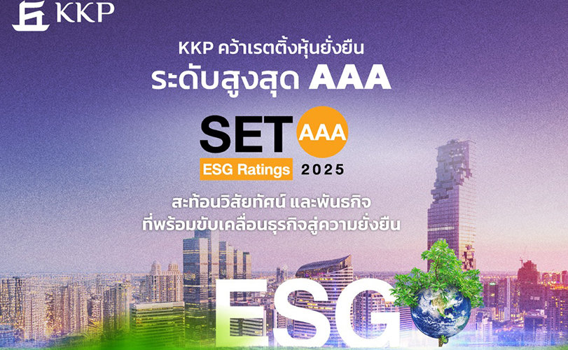 กลุ่มธุรกิจการเงินเกียรตินาคินภัทร (KKP) ประกาศความสำเร็จในการประเมินหุ้นยั่งยืน SET ESG Ratings ประจำปี 2568 ก้าวสู่ระดับสูงสุด AAA ครั้งแรก เป็นเครื่องยืนยันความมุ่งมั่นของทีมงาน KKP ทุกภาคส่วน ในการขับเคลื่อนการดำเนินธุรกิจการเงินอย่างรับผิดชอบและยั่งยืน เพื่อสร้างคุณค่าให้แก่ผู้มีส่วนได้เสียอย่างรอบด้าน