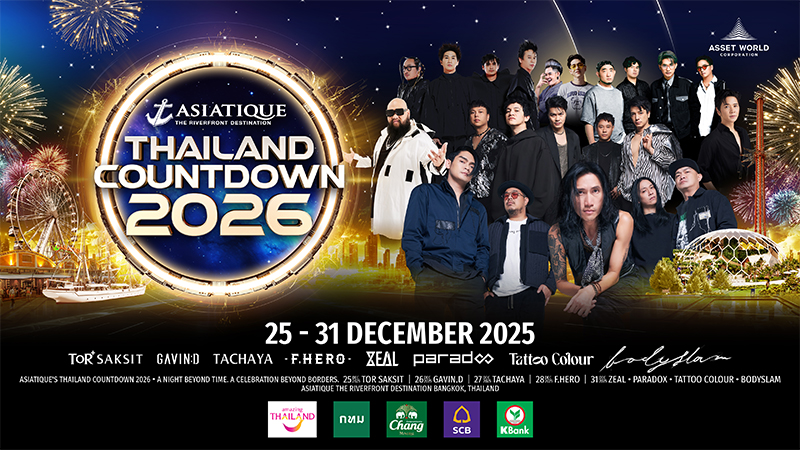 เอเชียทีค เดอะ ริเวอร์ฟร้อนท์ เดสติเนชั่น ภายใต้การบริหารงานของ แอสเสท เวิรด์ คอร์ปอเรชั่น (AWC) พร้อมด้วยพันธมิตร อาทิ การท่องเที่ยวแห่งประเทศไทย กรุงเทพมหานคร น้ำแร่ธรรมชาติตราช้าง ธนาคารไทยพาณิชย์ และ ธนาคารกสิกรไทย ผนึกกำลังจัดงาน “ASIATIQUE’s THAILAND COUNTDOWN 2026” สร้างสรรค์ประสบการณ์เฉลิมฉลองข้ามปีสุดยิ่งใหญ่ริมแม่น้ำเจ้าพระยา ครั้งแรกกับงานเคานต์ดาวน์ 5 วันเต็ม ตั้งแต่วันที่ 25 – 28 และ 31 ธันวาคม 2568