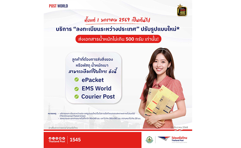 ทั้งนี้ ตามข้อกำหนดใหม่ของสหภาพสากลไปรษณีย์ (The Universal Postal Union) ที่มีการเปลี่ยนแปลง ส่งผลให้เงื่อนไขการบริการต้องปรับเปลี่ยนเพื่อให้สอดคล้องกับมาตรฐานการให้บริการลงทะเบียนระหว่างประเทศทุกการไปรษณีย์ทั่วโลก ซึ่งจะส่งได้เฉพาะเอกสารน้ำหนัก ไม่เกิน 500 กรัมเท่านั้น โดยมีรายละเอียดของประเภทเอกสาร ได้แก่ เอกสารแบบแผ่น แบบเย็บเล่ม สิ่งพิมพ์ ขนาดไม่ต่ำกว่า 90x140 มม. และไม่เกิน 305x381 มม. ความหนาไม่เกิน 20 มม. เริ่ม 1 มกราคม 2569 เป็นต้นไป สำหรับผู้ใช้บริการที่ต้องการส่งสิ่งของน้ำหนักเบา สามารถเลือกใช้บริการส่งประหยัดระหว่างประเทศ ePacket ราคาสบายกระเป๋า ครอบคลุม 106 ปลายทาง หรือใช้บริการส่งด่วนทั่วโลก EMS World หรือบริการส่งด่วนพรีเมียมทั่วโลก Courier Post ได้