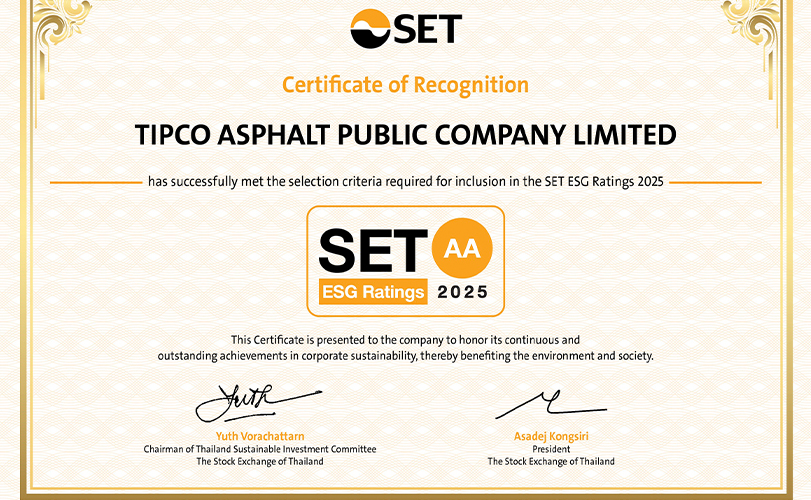 บริษัท ทิปโก้แอสฟัลท์ จำกัด (มหาชน) หรือ TASCO ได้รับการประเมินผลหุ้นยั่งยืน SET ESG Ratings ประจำปี 2568 ระดับ “AA” ในกลุ่มอุตสาหกรรมอสังหาริมทรัพย์และก่อสร้าง ต่อเนื่องเป็นปีที่ 2 จากตลาดหลักทรัพย์แห่งประเทศไทย โดยในปี 2568 มีบริษัทจดทะเบียนที่ผ่านเกณฑ์และได้รับการประกาศผลประเมินหุ้นยั่งยืน SET ESG Ratings 265 บริษัท