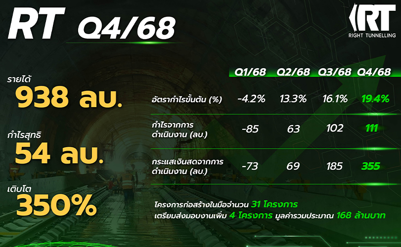 นายชวลิต ถนอมถิ่น ประธานเจ้าหน้าที่บริหาร บริษัท ไร้ท์ทันเน็ลลิ่ง จำกัด (มหาชน) หรือ RT ผู้เชี่ยวชาญพิเศษด้านขุดเจาะอุโมงค์ วิศวกรรมโยธา และ ธรณีเทคนิคครบวงจร เปิดเผยถึง ผลประกอบการไตรมาส 4 ปี 2568 ว่า บริษัทมีรายได้รวม 938 ล้านบาท ลดลงจากช่วงเดียวกันปีก่อนที่มีรายได้รวม 970 ล้านบาท จำนวน 32 ล้านบาท หรือลดลง 3% และมีกำไรสุทธิ 54 ล้านบาท เพิ่มขึ้นจากช่วงเดียวกันปีก่อนที่มีกำไรสุทธิ 12 ล้านบาท จำนวน 42 ล้านบาท หรือเพิ่มขึ้น 350%