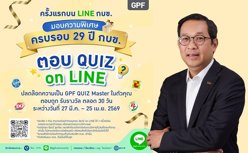 สำหรับกิจกรรมพิเศษในโอกาสครบรอบ 29 ปีนี้ กบข. เปิดให้สมาชิกใช้คะแนน GPF Point เพียง 29 คะแนน แลกรับส่วนลดจากร้านค้าอาหารและเครื่องดื่มชั้นนำ อาทิ บูสท์จูซบาร์, บอนชอน, เดอะ พิซซ่า คอมปะนี และ เอสแอนด์พี รวมกว่า 3,200 รางวัล เฉพาะวันที่ 27 มีนาคม 2569 เท่านั้น พร้อมกิจกรรม Quiz on LINE ผ่าน LINE @gpfcommunity ที่เปิดให้สมาชิกร่วมตอบคำถามวันละครั้ง โดยคำถามครอบคลุมความรู้เกี่ยวกับ กบข. ทั้งด้านการออม การลงทุน บริการ My Digital Twins และสิทธิประโยชน์ต่างๆ เพื่อช่วยเสริมความเข้าใจและการวางแผนทางการเงินของสมาชิก และยังได้ลุ้นรับของรางวัลรวมกว่า 200,000 รางวัล เช่น ส่วนลดบิ๊กซี แดรี่ควีน และคะแนน GPF Point 10–20 คะแนน สมาชิกร่วมสนุกได้ตั้งแต่วันที่ 27 มีนาคม – 25 เมษายน 2569 สอบถามข้อมูลเพิ่มเติมได้ที่ Facebook กบข. หรือ LINE @gpfcommunity หรือศูนย์บริการข้อมูลสมาชิก โทร 1179