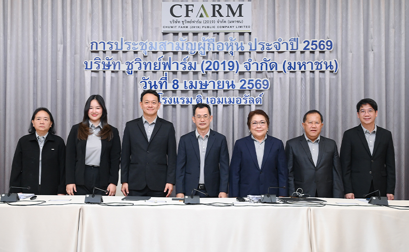 นายเทพกุล พูลลาภ ประธานกรรมการ และนายชูรัตน์ จึงธนสมบูรณ์ กรรมการผู้จัดการ พร้อมด้วยคณะกรรมการบริษัทฯ บริษัท ชูวิทย์ ฟาร์ม (2019) จำกัด (มหาชน) หรือ CFARM ประกอบธุรกิจฟาร์มเลี้ยงไก่เนื้อในรูปแบบเกษตรพันธสัญญา เปิดเผยว่าที่ประชุมสามัญผู้ถือหุ้นประจำปี 2569 โดยเป็นการประชุมรูปแบบ Hybrid เพื่อรับทราบผลการดำเนินงานประจำปี 2568 คณะกรรมการบริษัทมีมติอนุมัติการจ่ายเงินปันผลจากผลการดำเนินงานประจำปี 2568 และกำไรสะสม ในอัตราหุ้นละ 0.02 บาท คิดเป็นมูลค่ารวมทั้งสิ้นประมาณ 11.6 ล้านบาท ทั้งนี้ บริษัทกำหนดรายชื่อผู้ถือหุ้นที่มีสิทธิได้รับเงินปันผล (Record Date) ในวันที่ 20 เมษายน 2569 และกำหนดจ่ายเงินปันผลในวันที่ 7 พฤษภาคม 2569