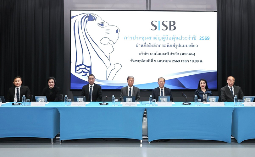 คุณนนทิกร กาญจนะจิตรา ประธานกรรมการ และคุณยิว ฮอค โคว ประธานเจ้าหน้าที่บริหาร พร้อมคณะกรรมการและคณะผู้บริหาร บริษัท เอสไอเอสบี จำกัด (มหาชน) (SISB) ถ่ายภาพร่วมกันหลังการประชุมสามัญผู้ถือหุ้นประจำปี 2569 โดยผู้ถือหุ้นมีมติอนุมัติจ่ายเงินปันผลงวดปี 2568 ในอัตราหุ้นละ 0.51 บาท กำหนดจ่ายเงินปันผลในวันที่ 30 เมษายน 2569 ซึ่งงานดังกล่าวจัดขึ้นที่บริษัทฯ