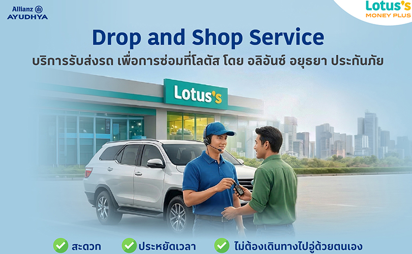 โลตัส มันนี่ พลัส ร่วมกับ อลิอันซ์ อยุธยา ประกันภัย ยกระดับบริการ เปิดบริการใหม่ “Drop and Shop Service” ตั้งแต่ 1 มีนาคม 2569 – 31ธันวาคม 2569 บริการรับ-ส่งรถเพื่อการซ่อมที่โลตัส โดยอลิอันซ์ อยุธยา ประกันภัย บริการนัดหมายรับ-ส่งรถซ่อมผ่านห้างโลตัสใกล้บ้าน สำหรับลูกค้าโลตัส มันนี่พลัสที่ซื้อประกันภัยรถยนต์อลิอันซ์ อยุธยาผ่านโลตัสส์ อินชัวร์รันส์ โบรคเกอร์ แบบความคุ้มครองเพิ่มเติมพิเศษ “All in One Care” เพิ่มความสะดวกยิ่งขึ้น ในการนัดหมาย รับ ส่ง รถซ่อม โดยไม่ต้องเดินทางไปอู่ด้วยตนเอง เพียงติดต่อศูนย์บริการลูกค้าอลิอันซ์ อยุธยา ประกันภัย (AAGI) โทร 1292 เพื่อขอใช้บริการและนัดหมายอู่ซ่อมรถที่เข้าร่วมโครงการ (ระยะไม่เกิน 10 กิโลเมตรจากจุดรับ – ส่งรถ) โดยอู่คู่สัญญาที่ได้รับมอบหมายจะโทรศัพท์หาลูกค้า เพื่อยืนยันการนัดหมายและสอบถามข้อมูลเบื้องต้นของการเคลม และลูกค้าสามารถนำรถยนต์มาฝากไว้ที่โลตัสเฉพาะสาขาที่มีเคาน์เตอร์โลตัส มันนี่ พลัสให้บริการ ซึ่งเป็นจุดนัดหมายหลังซ่อมเสร็จอู่จะโทรนัดลูกค้า เพื่อนำรถมาส่งคืนที่สาขาโลตัสบริการนี้สำหรับลูกค้าผู้ถือกรมธรรม์ประกันภัยของอลิอันซ์ อยุธยา ประกันภัย ที่ซื้อประกันผ่านโลตัสส์ อินชัวร์รันส์ โบรคเกอร์ และมีเงื่อนไขการให้บริการเป็นไปตามที่บริษัทประกันภัยกำหนด ข้อมูลเพิ่มเติม https://lmp-mkt.link/467d64