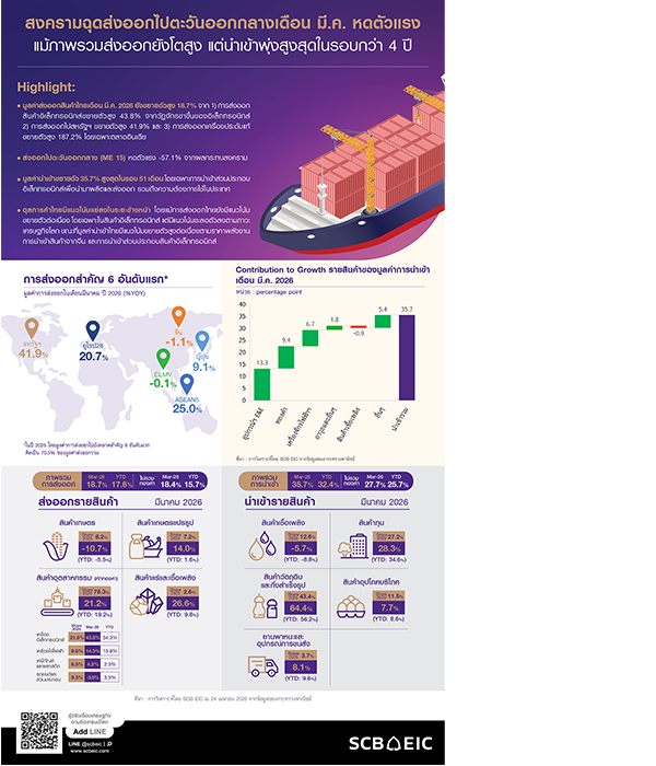 มูลค่าส่งออก 35,157.1 ล้านดอลลาร์สหรัฐเติบโตสูง 18.7% จาก 9.9% ในเดือนก่อน และขยายตัวมากกว่าที่ประเมินไว้ (SCB EIC ประเมิน 11.6% และค่ากลาง Reuters Poll 9.8%) มูลค่าส่งออกที่ปรับฤดูกาลแล้วขยายตัว 4.9%MOM_SA ภาพรวมมูลค่าส่งออกไทยในไตรมาสแรกของปี 2026 ขยายตัวต่อเนื่อง 17.6%