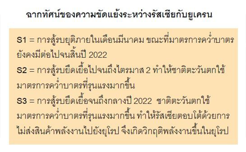วิจัยกรุงศรีประเมินความเป็นไปได้ของผลกระทบจากความขัดแย้งระหว่างรัสเซียกับยูเครนจำแนกเป็น 3 กรณี ได้แก่ (1) การสู้รบยุติภายในเดือนมีนาคม ขณะที่มาตรการคว่ำบาตรจากชาติตะวันตกแบนการค้าและธุรกรรมทางการเงินของรัสเซียบางส่วนไปจนถึงสิ้นปีนี้ (2) การสู้รบยืดเยื้อไปจนถึงไตรมาส 2/2565 ทำให้ชาติตะวันตกใช้มาตรการคว่ำบาตรที่รุนแรงมากขึ้น มีการแบนสินค้าที่ไม่ใช่พลังงานจากรัสเซียทั้งหมด และ (3) การสู้รบยืดเยื้อและขยายขอบเขตไปยังประเทศอื่นจนถึงกลางปี 2565 ชาติตะวันตกใช้มาตรการคว่ำบาตรรุนแรงมากขึ้น ทำให้รัสเซียตอบโต้ด้วยการยุติการส่งออกสินค้าพลังงานไปยังยุโรป จนนำไปสู่วิกฤตพลังงานขึ้นในยุโรป โดยช่องทางการส่งผ่านผลกระทบหลักมีทั้งหมด 4 ด้าน ได้แก่ การค้าและการขนส่ง ความมั่นคงด้านพลังงาน เสถียรภาพด้านราคา และผลจากรายได้และตลาดการเงิน