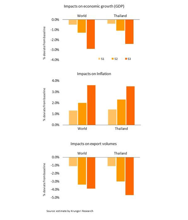วิจัยกรุงศรีใช้แบบจำลอง Dynamic Stochastic General Equilibrium (DSGE) คำนวณหาผลกระทบต่อเศรษฐกิจโลกและเศรษฐกิจไทย โดยผลต่อไทย พบว่า เศรษฐกิจไทยมีแนวโน้มขยายตัวต่ำกว่าที่คาดไว้ในกรณีฐาน 0.4% 1.1% และ 2.4% ตามลำดับ ส่วนอัตราเงินเฟ้อเร่งตัวกว่าที่่คาดไว้ 1.4% 2.3% และ 3.5% ตามลำดับ ขณะที่ปริมาณการส่งออกลดลงจากกรณีฐาน 1.1% 3.0% และ 4.7% ตามลำดับ