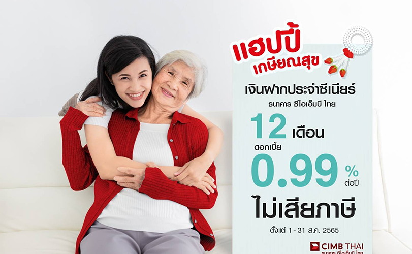 ต้อนรับวันแม่ปีนี้ ด้วยของขวัญพิเศษจาก ธนาคาร ซีไอเอ็มบี ไทย ด้วยโปรแกรมเงินฝากประจำพิเศษ เงินฝากประจำซีเนียร์ 12 เดือน อัตราดอกเบี้ย 0.99% ต่อปี ไม่ต้องเสียภาษีดอกเบี้ยเงินฝาก สำหรับผู้มีอายุ 55 ปีบริบูรณ์ขึ้นไป ณ วันที่เปิดบัญชี เปิดบัญชีขั้นต่ำ 10,000 บาท สูงสุดไม่เกิน 2.5 ล้านบาท รับดอกเบี้ยรายเดือน โดยโอนเข้าบัญชีออมทรัพย์ ธนาคาร ซีไอเอ็มบี ไทย เปิดรับฝากระหว่างวันที่ 1 - 31 สิงหาคม 2565 สนใจสอบถามข้อมูลเพิ่มเติมได้ที่ 02 626 7777 หรือ www.cimbthai.com