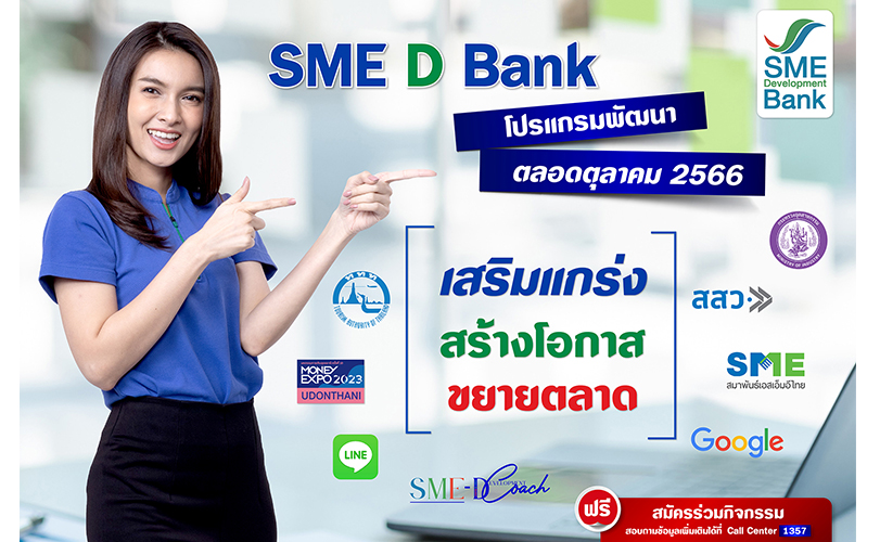 ธนาคารพัฒนาวิสาหกิจขนาดกลางและขนาดย่อมแห่งประเทศไทย (ธพว.) หรือ SME D Bank ธนาคารเพื่อเอสเอ็มอีไทย สนับสนุนผู้ประกอบการเอสเอ็มอีเดินหน้าธุรกิจ ยกขบวนเติมความรู้ ตอบครบทุกความต้องการ ตลอดเดือนตุลาคม 2566 ช่วยเพิ่มขีดความสามารถ ขยายตลาด สร้างโอกาสธุรกิจ ก้าวสู่ความสำเร็จ ทุกโปรแกรมรับบริการ ฟรี สมัครร่วมกิจกรรมหรือสอบถามข้อมูลเพิ่มเติม Call CENTER 1357