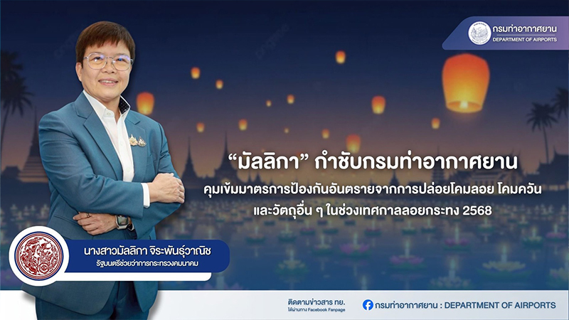 มัลลิกา กำชับกรมท่าอากาศยานคุมเข้มมาตรการป้องกันอันตรายจากการปล่อยโคมลอย โคมควัน และวัตถุอื่น ๆ ในช่วงเทศกาลลอยกระทง 2568
