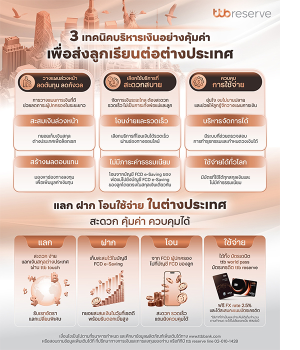 ttb reserve ในฐานะผู้ช่วยวางแผนทางการเงินและต่อยอดความมั่งคั่งครบทุกมิติสู่ความสำเร็จไม่มีสิ้นสุด แนะนำ 3 เทคนิควางแผนทางการเงินเพื่อส่งลูกเรียนต่างประเทศ บริหารเงินอย่างไรให้คุ้มค่า ในการจัดการเงินออม การลงทุน และความเสี่ยง ผ่านขั้นตอนที่ช่วยให้ผู้ปกครองสามารถเตรียมแผนการเงินเพื่อการศึกษาต่างประเทศได้อย่างมั่นใจ ท่ามกลางเศรษฐกิจที่ท้าทาย