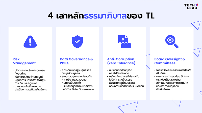 TL บริหารความเสี่ยงครอบคลุมทั้งภายนอกและภายในบริษัทให้ครอบคลุม และสอดคล้องกับกลยุทธ์และทิศทางของธุรกิจ โดยเฉพาะความเสี่ยงด้านกลยุทธ์และแผนการดำเนินธุรกิจ (Strategy & Planning Risk) ความเสี่ยงด้านการดำเนินงานและระบบโครงสร้างพื้นฐาน (Operation and Infrastructure Risk) ความเสี่ยงด้านการรายงานทางการเงิน (Financial Reporting Risk) และความเสี่ยงด้านการปฏิบัติตามกฎหมาย (Compliance Risk) เพื่อรักษาความต่อเนื่องทางธุรกิจอย่างมั่นคง รวมถึงยกระดับมาตรฐานความปลอดภัยในเรื่องการคุ้มครองข้อมูลส่วนบุคคล หรือ PDPA และ Data Governance พร้อมมาตรการควบคุมที่มีความชัดเจนและการทบทวนการบังคับใช้อย่างสม่ำเสมอ ยึดหลัก Zero Tolerance ต่อการทุจริตคอร์รัปชั่น พร้อมกลไกตรวจสอบและ แจ้งเบาะแสที่โปร่งใสและเป็นธรรมตามหลักธรรมาภิบาลสำหรับผู้มีส่วนได้ส่วนเสีย ผ่านการคุ้มครองสิทธิผู้ถือหุ้นและการพัฒนาบุคลากรอย่างต่อเนื่อง มุ่งเติบโตอย่างยั่งยืนตาม ESG ใช้เทคโนโลยีเพิ่มประสิทธิภาพทรัพยากร สร้างผลลัพธ์เชิงบวกต่อสังคมควบคู่กับผลประกอบการ