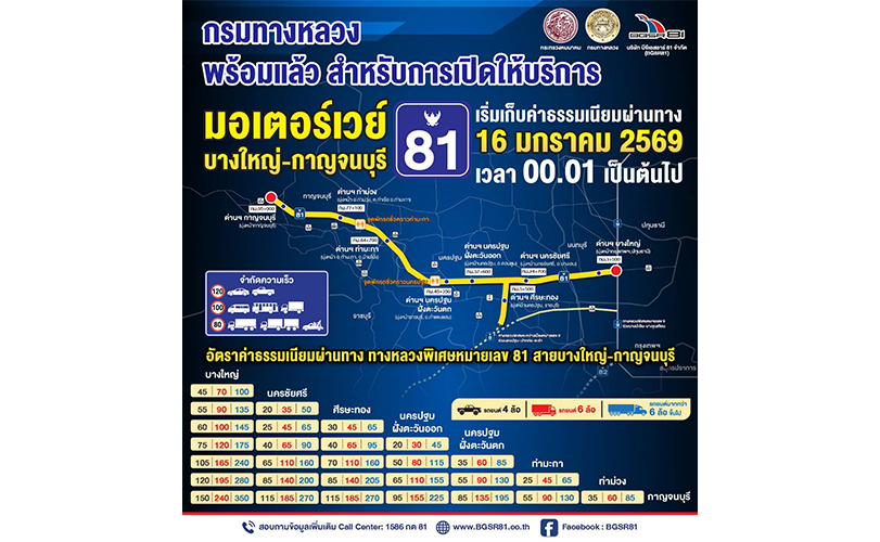 สำหรับการใช้งานเส้นทางมอเตอร์เวย์ M81 สายบางใหญ่ - กาญจนบุรี ที่จะเริ่มเก็บค่าธรรมเนียมผ่านทาง ตั้งแต่วันที่ 16 มกราคม 2569 เป็นต้นไปนี้ กรมทางหลวงขอฝากถึงพี่น้องประชาชนที่จะเข้ามาใช้เส้นทางให้ขับขี่อย่างปลอดภัย โดยใช้ความเร็วสูงสุดไม่เกินอัตราที่กำหนด คือ รถยนต์ 4 ล้อ ไม่เกิน 120 กม./ชม., รถโดยสาร/รถบรรทุก ไม่เกิน 100 กม./ชม., และรถบรรทุกหนัก/รถลากจูง ไม่เกิน 80 กม./ชม.