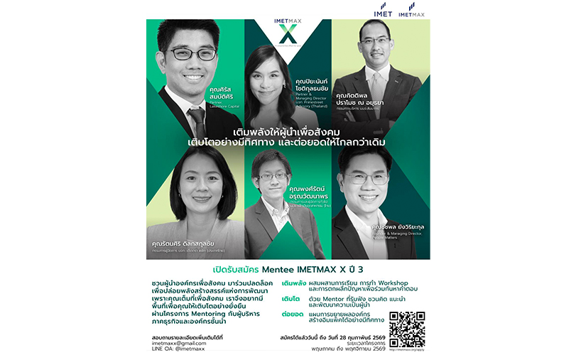 ในปี 2569 นี้ มูลนิธิเพื่อสถาบันการศึกษาวิชาการจัดการแห่งประเทศไทย (IMET) พร้อมต่อยอดความสำเร็จเปิดรับสมัคร "ผู้นำทางสังคม" (Social Changemakers) องค์กรนิติบุคคล ประเภทบริษัทจำกัด หรือ มูลนิธิ ร่วมเรียนรู้ผ่านกระบวนการ Mentoring กับ 18 ผู้บริหารระดับสูงจากองค์กรชั้นนำของประเทศ ในโครงการ IMET MAX X ปี 3 ตั้งแต่วันนี้ ถึงวันที่ 28 กุมภาพันธ์ 2569 ที่ imetmaxx.org/apply สอบถามรายละเอียดเพิมเติมได้ที่ LINE OA: @imetmaxx หรือที่ imetmaxx@gmail.com