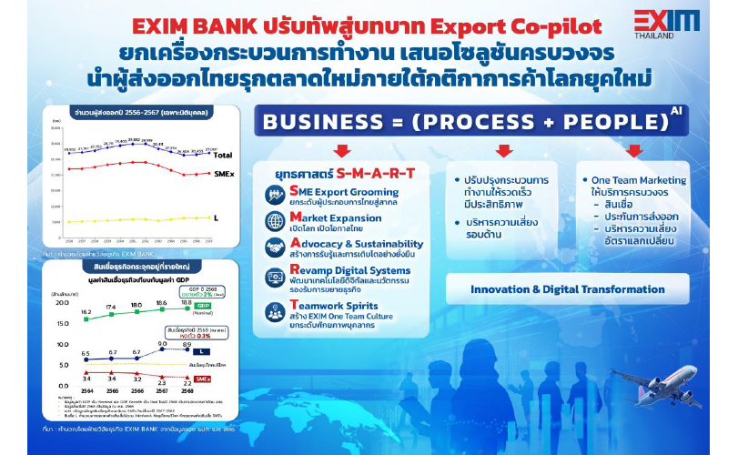 ในปี 2569 EXIM BANK เดินหน้าพัฒนาบทบาท Export Co-pilot อย่างเป็นรูปธรรม ผ่านการยกระดับเครื่องมือสนับสนุนผู้ส่งออกแบบครบวงจร เพื่อช่วยผู้ประกอบการไทย โดยเฉพาะ SMEs ก้าวข้ามความท้าทายของเศรษฐกิจโลกที่ผันผวนและข้อจำกัดเชิงโครงสร้างของประเทศ โดยเน้นการสร้างเกราะป้องกันความเสี่ยงผ่านแพ็กเกจสินเชื่อควบคู่บริการประกันการส่งออก และเครื่องมือบริหารความเสี่ยงด้านอัตราแลกเปลี่ยน เพื่อเสริมสภาพคล่องและเพิ่มขีดความสามารถในการแข่งขันในเวทีการค้าโลก ควบคู่กับการยกเครื่องกระบวนการทำงานขององค์กรด้วยนวัตกรรมและเทคโนโลยีดิจิทัล เพื่อการตัดสินใจบนฐานข้อมูล (Data-driven) ที่แม่นยำ เสริมความมั่นคงปลอดภัยทางไซเบอร์ และบริหารความเสี่ยงอย่างรอบด้าน ภายใต้ยุทธศาสตร์ S-M-A-R-T ได้แก่ SME Export Grooming การยกระดับผู้ประกอบการไทยสู่สากล Market Expansion การเปิดโลกและโอกาสทางการค้า Advocacy & Sustainability การสร้างการรับรู้และการเติบโตอย่างยั่งยืน Revamp Digital Systems การพัฒนาดิจิทัลและนวัตกรรมรองรับการขยายธุรกิจ และ Teamwork Spirits การสร้างวัฒนธรรม EXIM One Team เพื่อมุ่งสู่เป้าหมายขับเคลื่อนภาคธุรกิจ องค์กร ประเทศ และโลกสู่ความยั่งยืน