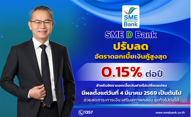 นายพิชิต มิทราวงศ์ กรรมการผู้จัดการ ธนาคารพัฒนาวิสาหกิจขนาดกลางและขนาดย่อมแห่งประเทศไทย (ธพว.) หรือ SME D Bank เปิดเผยว่า จากที่ประชุมคณะกรรมการนโยบายการเงิน (กนง.) เมื่อวันที่ 25 กุมภาพันธ์ 2569 มีมติลดอัตราดอกเบี้ยนโยบาย 0.25% ต่อปี จาก 1.25% เป็น 1.00% ต่อปี ดังนั้น SME D Bank ธนาคารเพื่อเอสเอ็มอีไทย ขานรับนโยบายธนาคารแห่งประเทศไทย (ธปท.) ประกาศปรับลดอัตราดอกเบี้ยเงินกู้สูงสุด 0.15% เพื่อบรรเทาภาระต้นทุนทางการเงินให้แก่ผู้ประกอบการเอสเอ็มอี และสนับสนุนการฟื้นตัวของเศรษฐกิจ โดยอัตราดอกเบี้ยเงินกู้ขั้นต่ำ (Minimum Loan Rate : MLR) อยู่ที่ 7.050% ต่อปี อัตราดอกเบี้ยลูกค้ารายย่อยชั้นดี (Minimum Retail Rate : MRR) อยู่ที่ 7.025% ต่อปี และ ประเภทเงินเบิกเกินบัญชี (Minimum Overdraft Rate : MOR) อยู่ที่ 7.150% ต่อปี มีผลตั้งแต่วันที่ 4 มีนาคม 2569 เป็นต้นไป