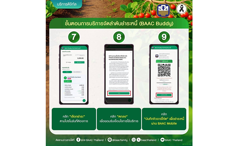 ทั้งนี้ ลูกค้าสามารถใช้งานฟีเจอร์ “BAAC Buddy” ผ่านแอปพลิเคชัน BAAC Mobile ได้แล้วตั้งแต่วันนี้ โดยไม่มีค่าธรรมเนียมเพิ่มเติม สอบถามรายละเอียดเพิ่มเติมที่ Call Center 02 555 0555 หรือ ธ.ก.ส. ทุกสาขา ทั่วประเทศ